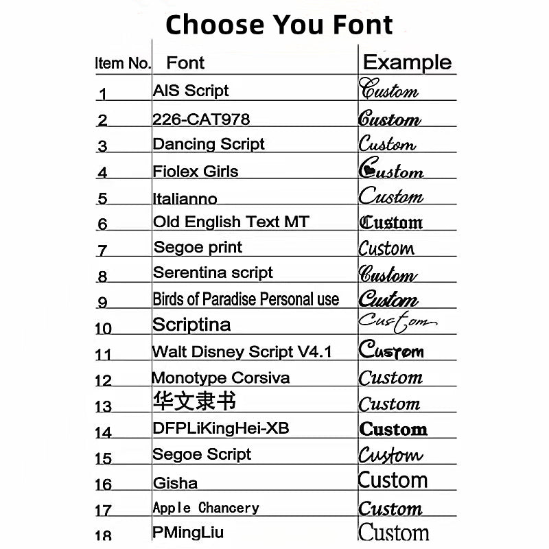 - Please choose your font before ordering
